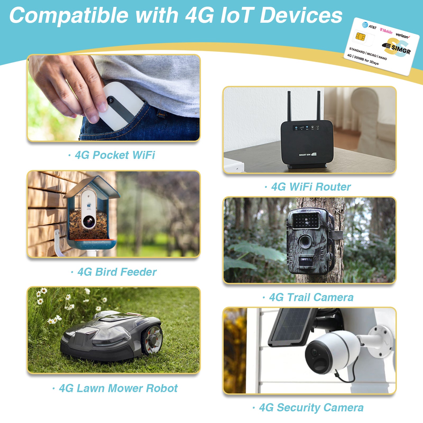 - Fit Unlocked 4G loT Devices: Our SIM card can be used for a lot of 4G devices, such as solar security camera, WiFi router, mobile hotspot, pocket WiFi, hunting camera, walkie talkie, 4G bird feeder and GPS pet/car tracker, etc.