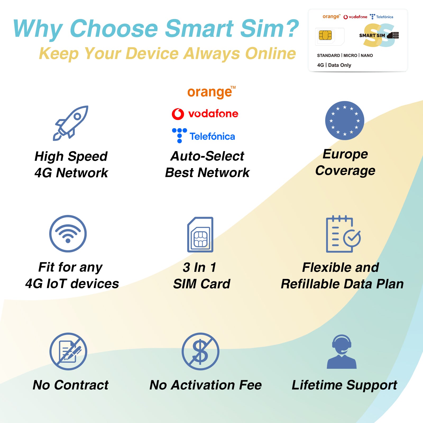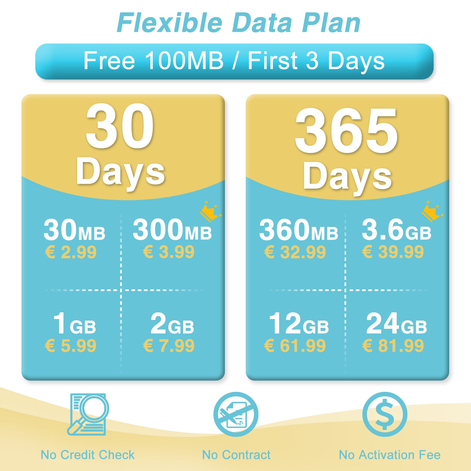 - Plug and Play: Our SIM card has no contract, no credit check, no force activation, no activation fee, no activation request in advance, no insert fee, no personal ID, no hidden cost, no tax, support service cancellation.